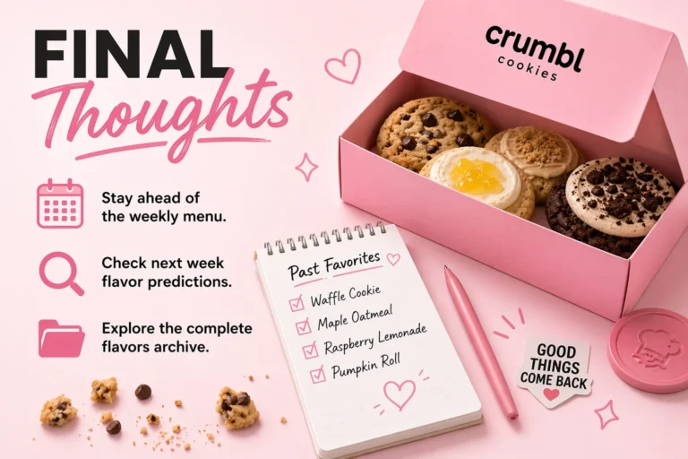 Keep an eye on the weekly Crumbl menu, stay ahead with our next week flavor predictions, and check our complete flavors archive regularly. Your favorite past flavor is probably coming back — you just need to be watching when it does.